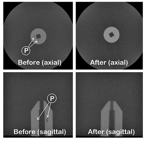 While often visible in parts made from transparent plastics, identifying voids in opaque parts requires either destructive physical sectioning, or analytical imaging. Genesis’ analytical lab was able to scan the molded parts and determine the process conditions for implantable PEEK and any mold modifications necessary to eliminate voids.