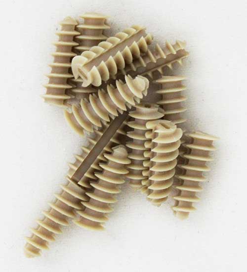 Arthroscopic surgery suture anchors injection molded from implantable PEEK polymer.