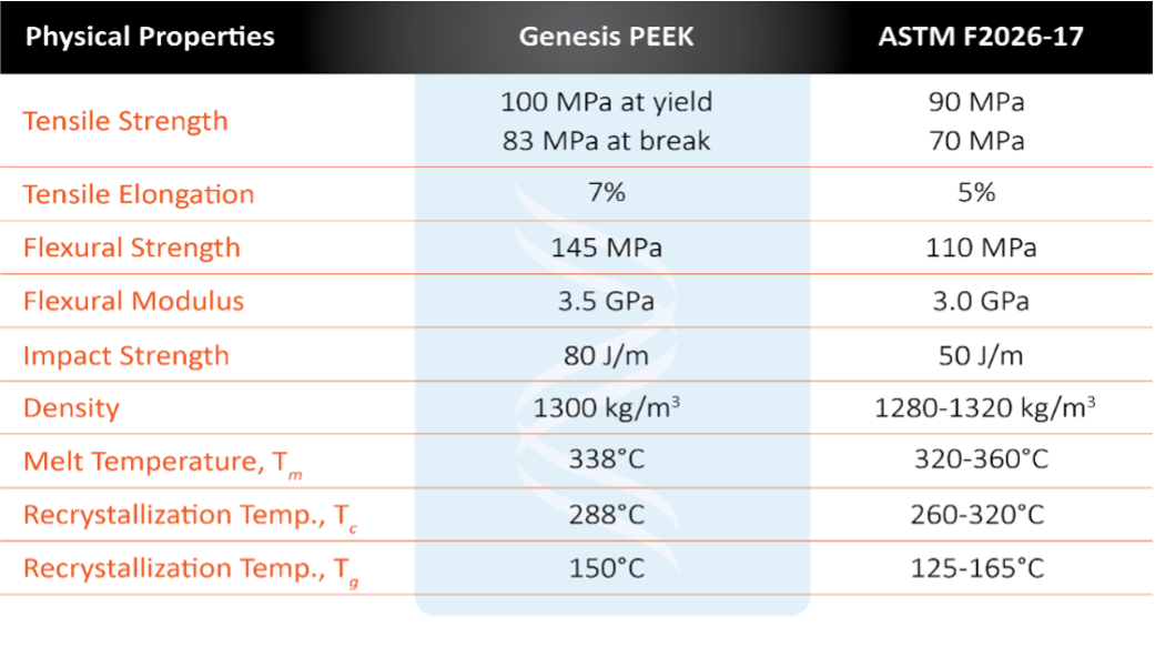 The implant grade PEEK resin used to produce Genesis Implantable PEEK film is compliant with ASTM F2026-17 requirements for mechanical properties and biocompatibility. The resin manufacturer is also ISO 13485:2016 certified and adheres to current Good Manufacturing Practices (cGMP).
