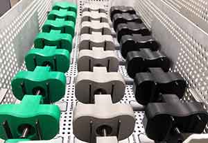 Made from medical plastics like Radel PPSU and acetal, joint replacement “trials” have internal tissue contact for short periods and must meet FDA Class 2 standards. The trials are color coded by size and must withstand repeated sterilization for multiple use.