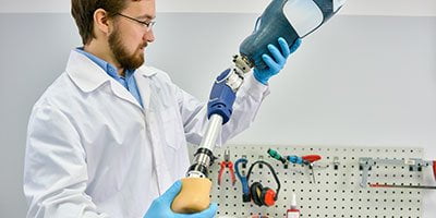 - Externally powered prostheses – Externally powered prostheses are at the frontier of prosthetics research in that they link what remains of the original limb with an electrode interface. When muscles are engaged in the upper arm, the electrodes sense the engagement and respond by opening or closing the prosthetic hand.