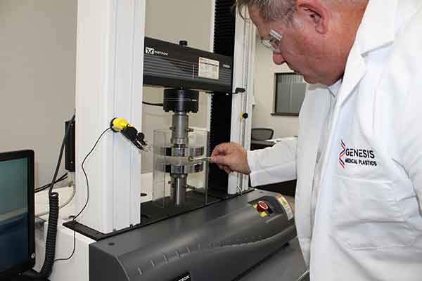 Genesis’ calibrated Instron Universal Test Machine measures mechanical properties on test specimens and can help determine if polymer formulations are achieving targeted performance levels. Test samples can be taken from stock shapes and in many cases from injection molded components depending on the configuration and size.