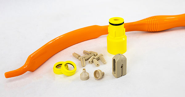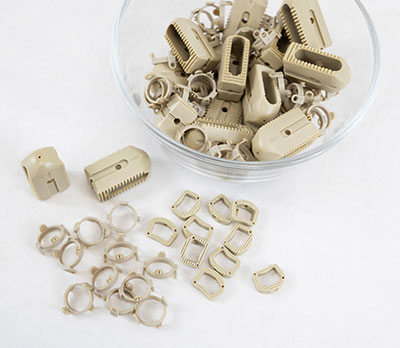 • Devices molded from implantable PEEK plastic demonstrate the precision the process affords. Finish-machining can add more complex details if needed.